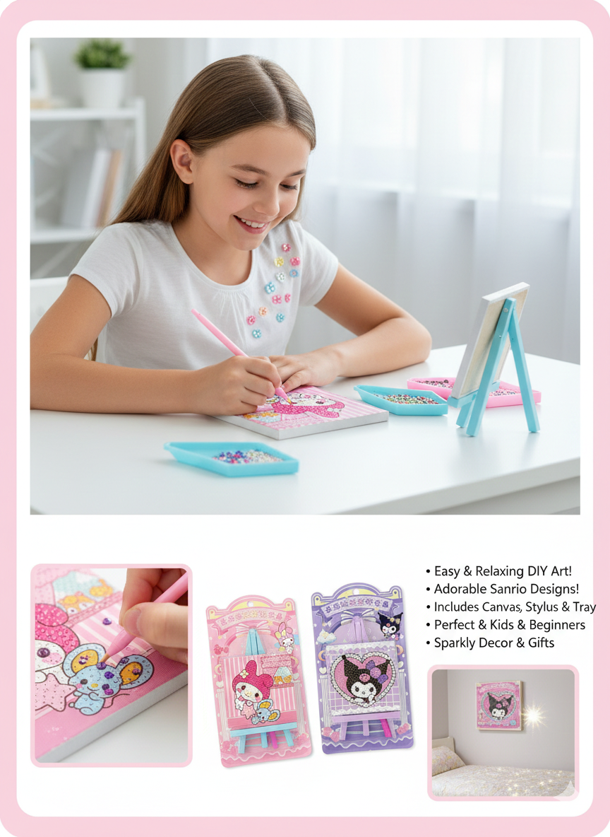 Unleash your creativity with these charming mini diamond painting kits featuring your favorite Sanrio-inspired characters! This all-in-one set is perfect for beginners, kids, or anyone looking for a quick, relaxing, and adorable crafting project.